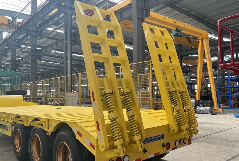 半挂平板运输车又名为平板拖车、半挂工程机械运输车通常采用凹梁式(或者井型)车架,既车架前段为鹅颈(鹅颈前段的牵引销与牵引车上的牵引鞍座相连,鹅颈后端与半挂车架相连),中段为货台(车架最低部分),后端为轮架(含车轮)。在往半挂工程机械运输车上装载机械设备时,通常是从半挂车后端装载机械设备,即采用从后轮架上面移动机械设备或者将车轮移除的方式,然后再将机械设备固定在半挂车上。